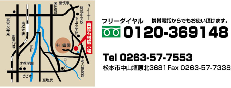 氏名 メールアドレス 題名 メッセージ本文 (任意) 有限会社興徳石材住所:長野県松本市中山植原北3681TEL:(0263)57-7553FAX:(0263)57-7338フリーダイヤル:0120-369-148代表取締役 前澤弘美